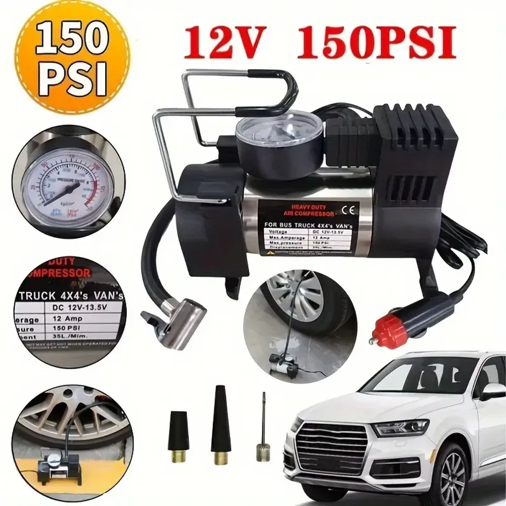 12V 150 Psi Deluxe Portable Metal Car Tire Inflator - Heavy-Duty, Fast Inflation, Compact Design, Easy to Use, Ideal for Cars, Trucks, SUVs, and Bicycles